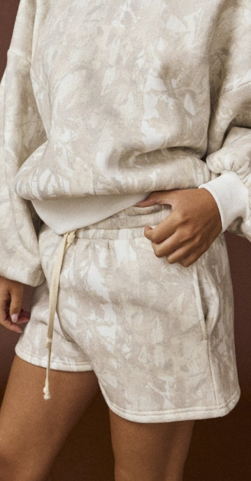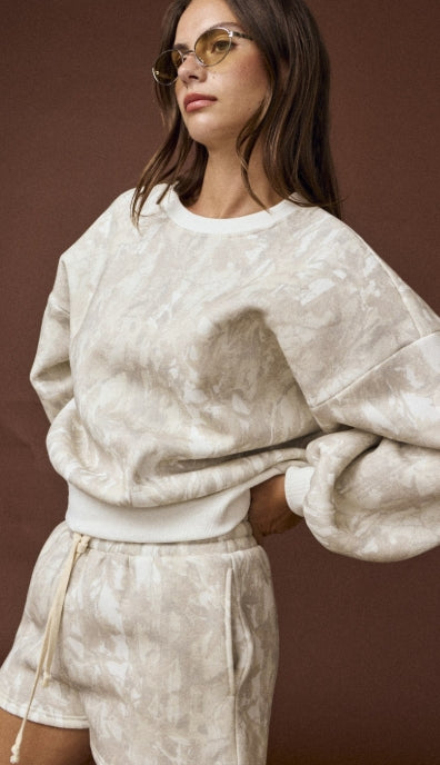 The crewneck sweatshirt features an oversized fit with dropped shoulders and ribbed cuffs for a slouchy, effortless vibe. Paired with matching drawstring shorts featuring an elastic waistband and side pockets, the set is equal parts functional and stylish. Its subtle neutral camo print adds just the right amount of texture and detail, making it versatile enough for at-home lounging or casual outings.